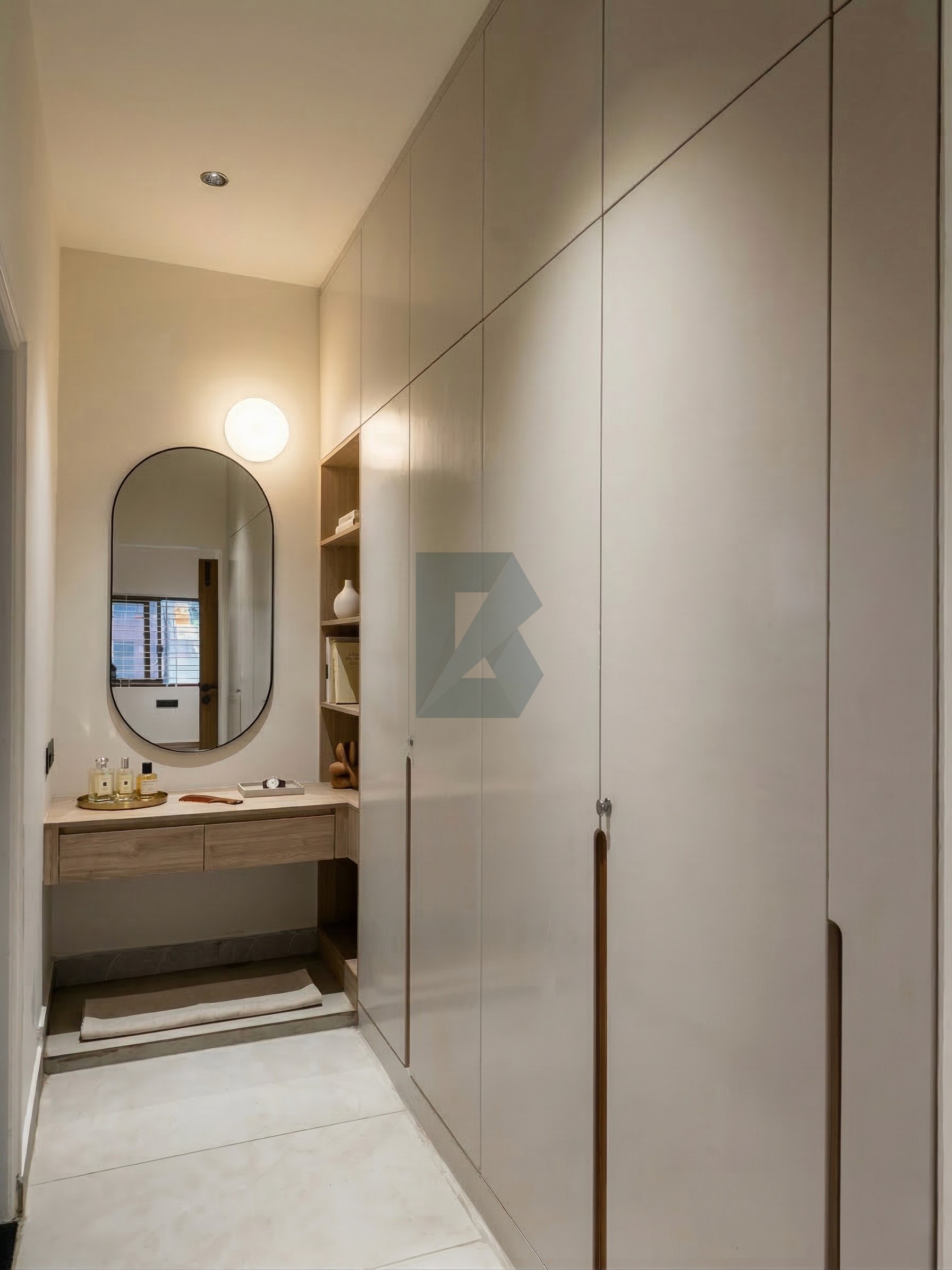 A calm apartment where integrated storage, restrained materials, and quieter detailing make daily life feel lighter.