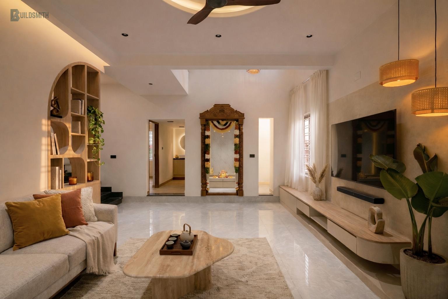 The living room anchors the home emotionally, organized around a hand-carved ancestral pooja mandir that the family brought into the design from the very beginning. Arched display joinery, rattan pendant lights, and a travertine coffee table build an atmosphere of curated calm around it, contemporary in its restraint, Indian in its soul.