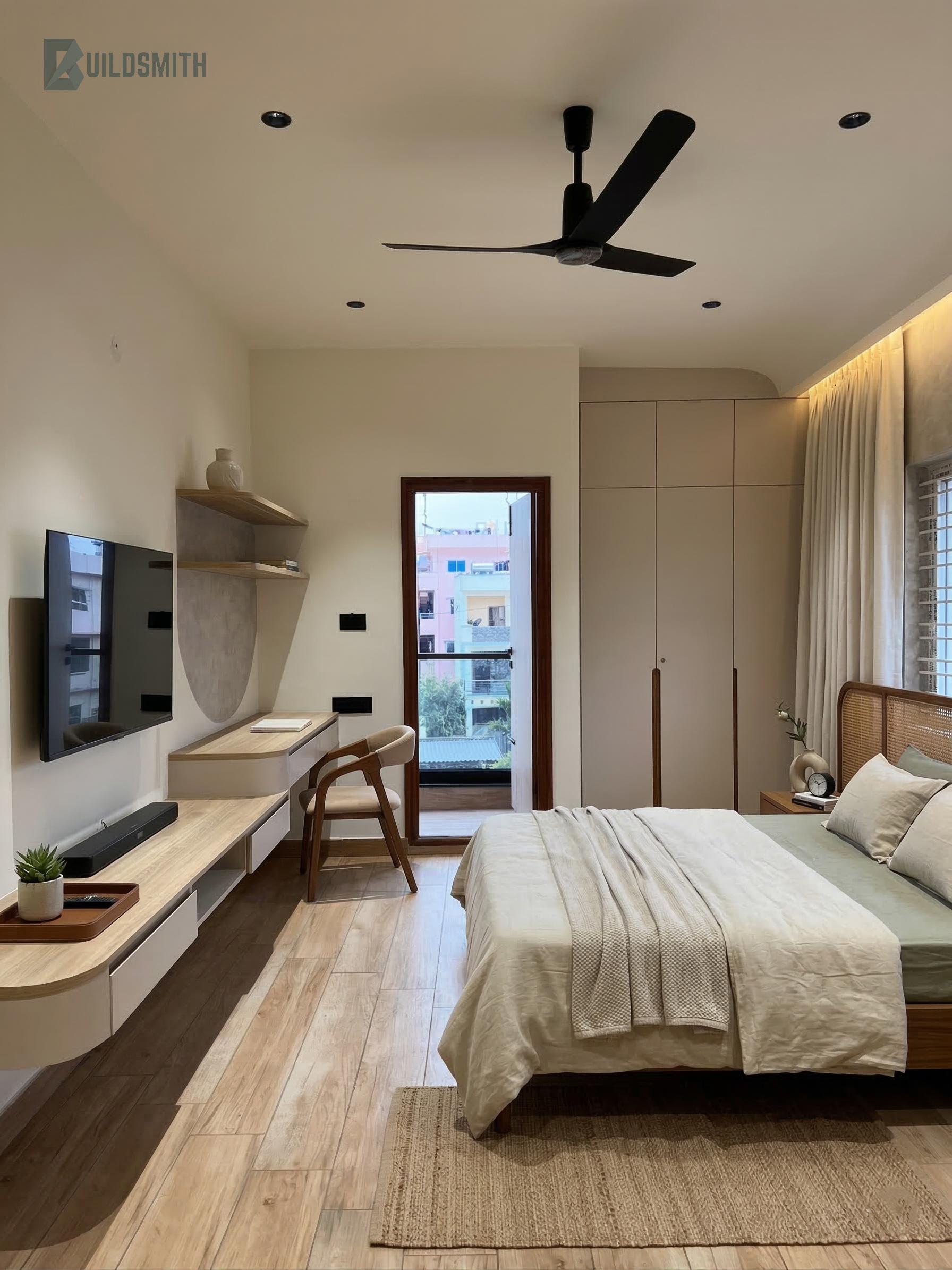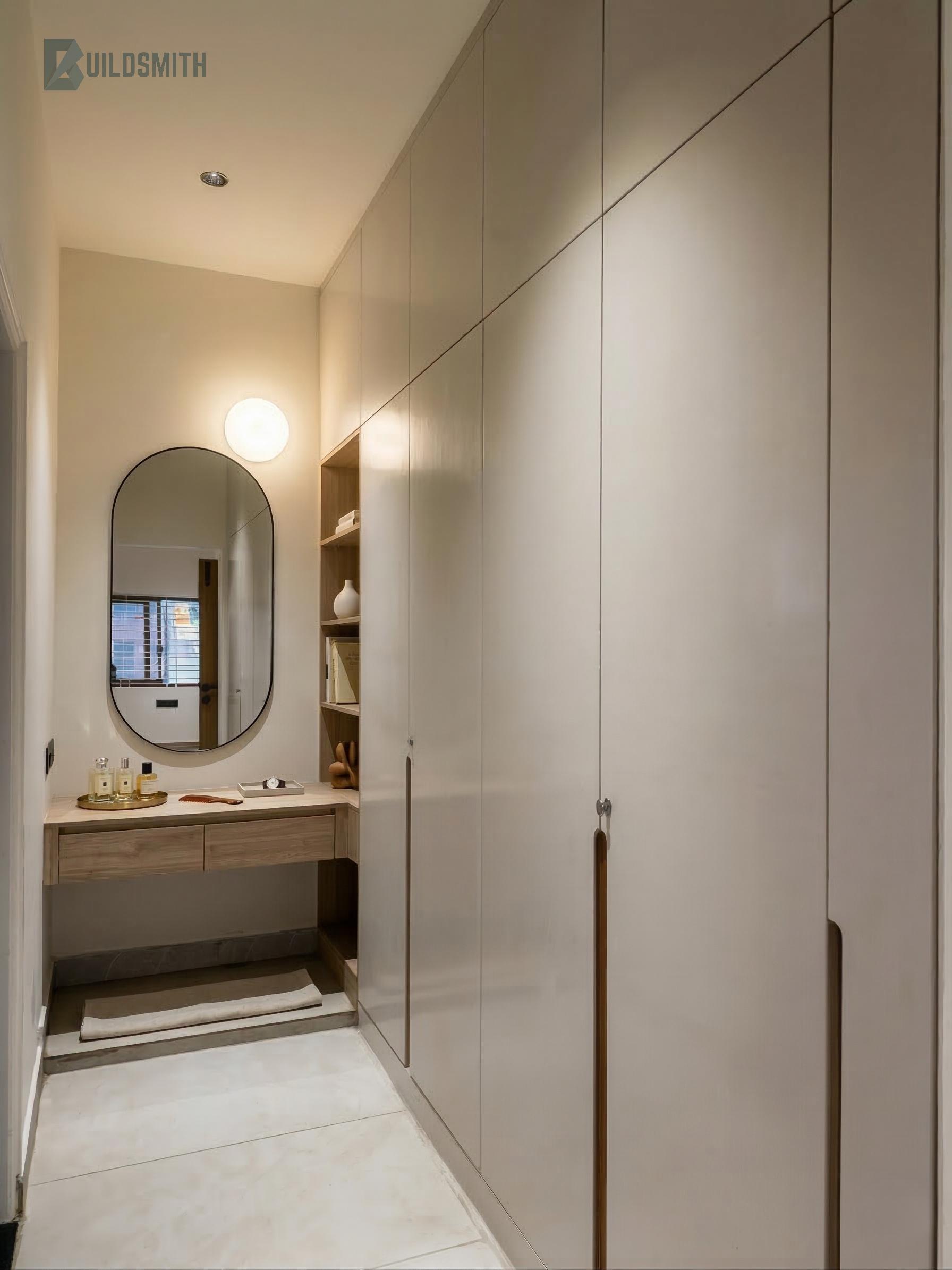 The bedrooms carry the home's material language with consistency, wood-textured floor tiles, textured lime plaster walls, black matt ceiling fans, and warm cove lighting create rooms that feel restful from the moment you enter. Full-height wardrobes in muted greige with brass-toned pulls, integrated dressing ledges, lit shelving niches, and oval mirrors reflect a attention to the rituals of everyday living. Each bedroom opens into a well-considered bathroom with clean, minimal detailing.