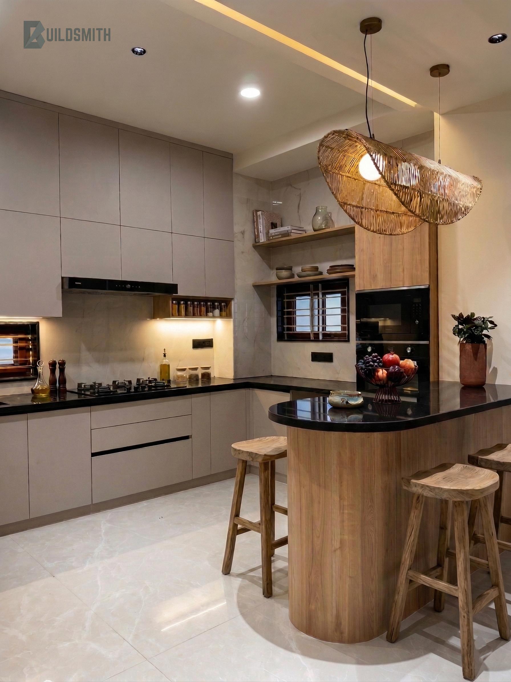 The kitchen is the home's most expressive room, a bold organic island with a curved solid wood base and black stone countertop sits beneath a dramatic rope chandelier, creating a space that is as sculptural as it is functional. Full-height matte cabinetry, warm under-cabinet lighting, and a marble-toned backsplash complete a kitchen that balances utility with character.