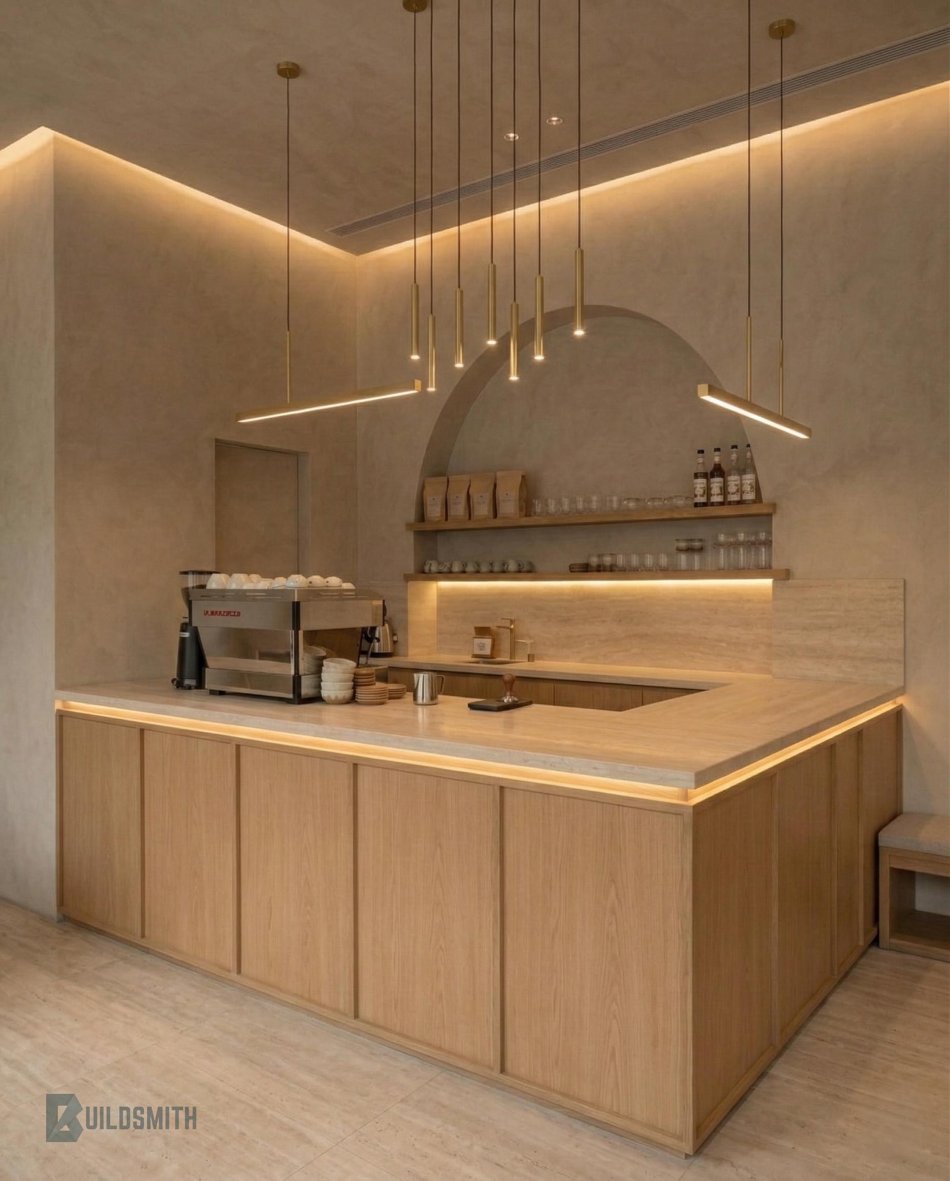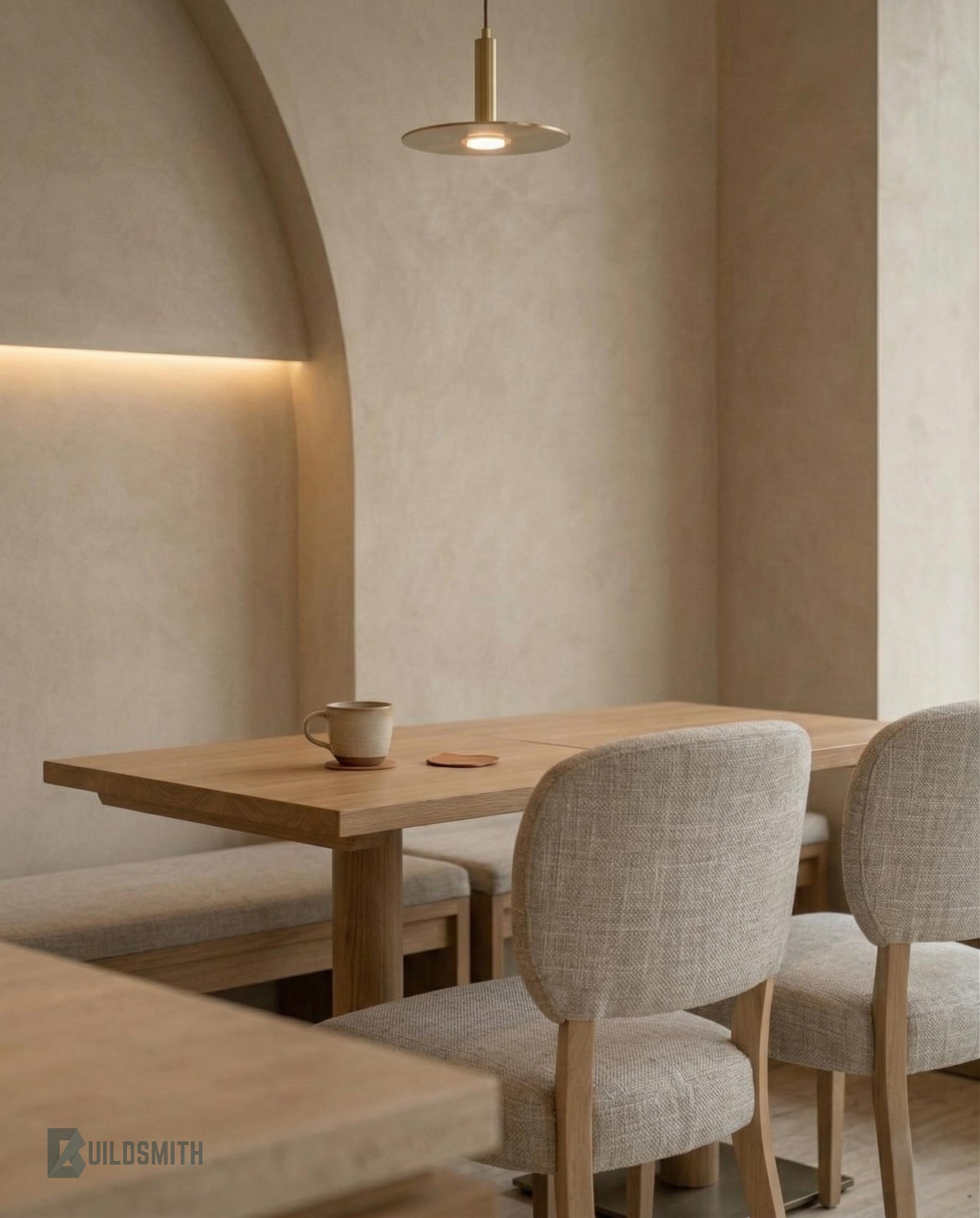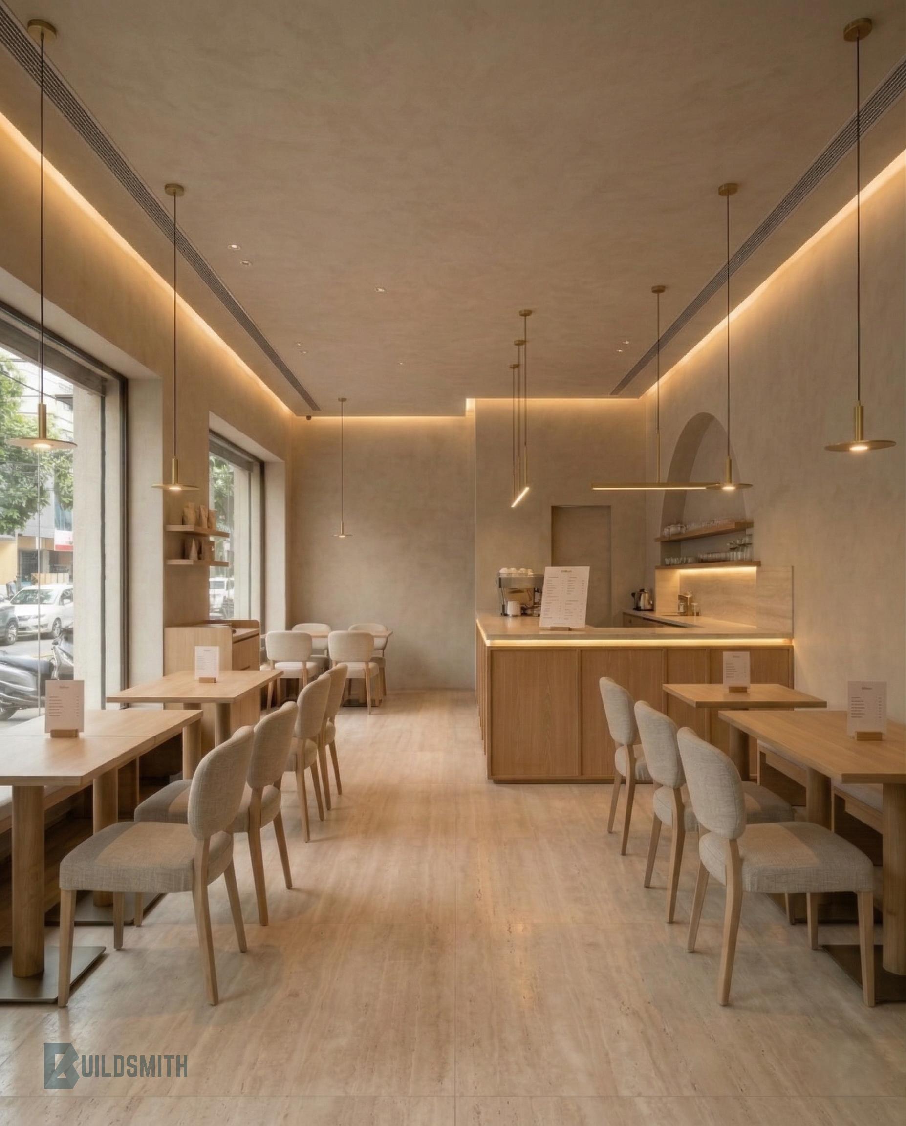 A study in restraint, this café was designed around the idea of quiet presence. Soft lime-washed walls, pale timber surfaces, and brushed brass lighting create a space where light becomes the primary material.